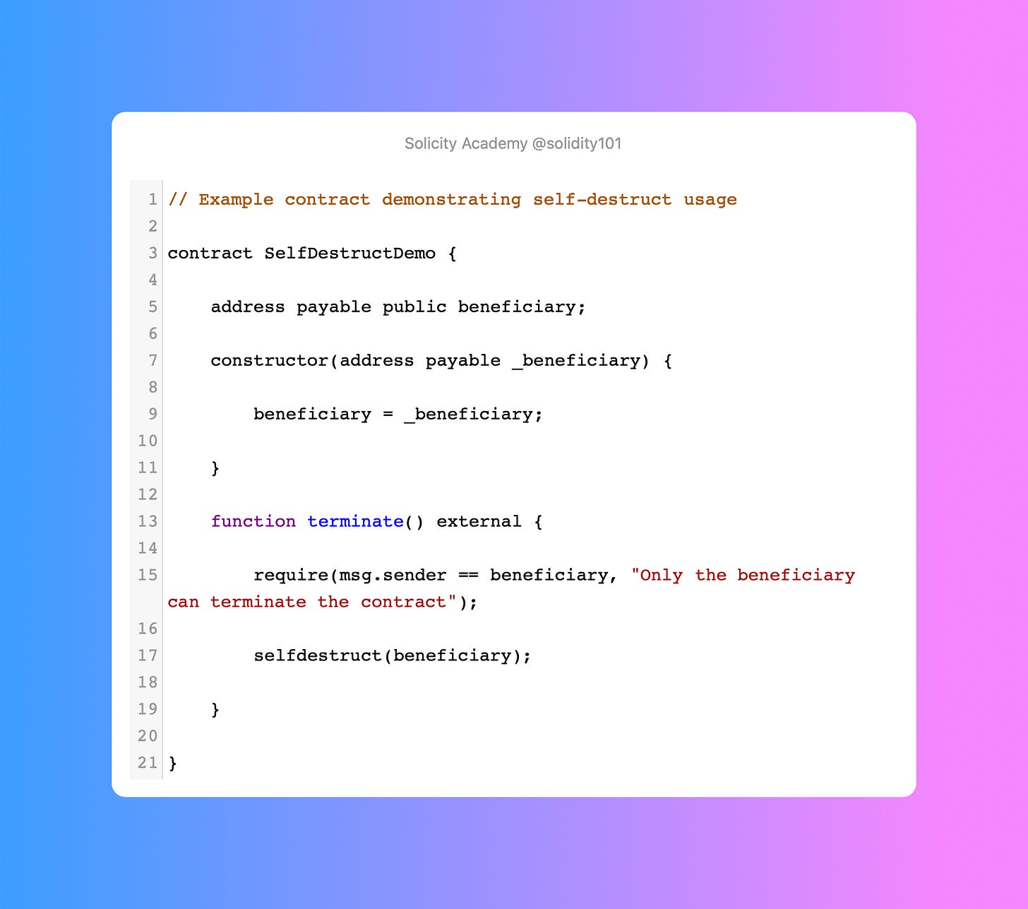 Welcome to Day 69 of the #100DaysOfSolidity series! 🎉 In today's installment, we're delving into the intriguing world of smart contract termination using the Ethereum `selfdestruct` operation. This is a technical journey, so buckle up and get ready for a unique exploration of this feature. 👨💻🔍